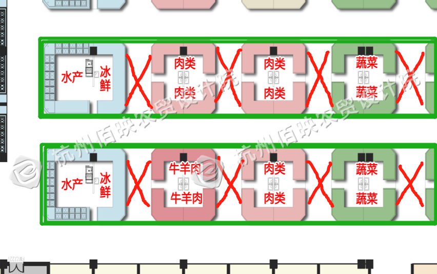以共享思维模式来解决配套功能,例如蔬菜整理间、熟食预进间等,这些功能都是规范要求必须配备的,但我们可以在一定程度上以“借用”的思维来处理,多个蔬菜摊位共用一个整理间,两个熟食营业房共用一个预进间,既满足了规范要求,又能节约空间,何乐而不为呢?