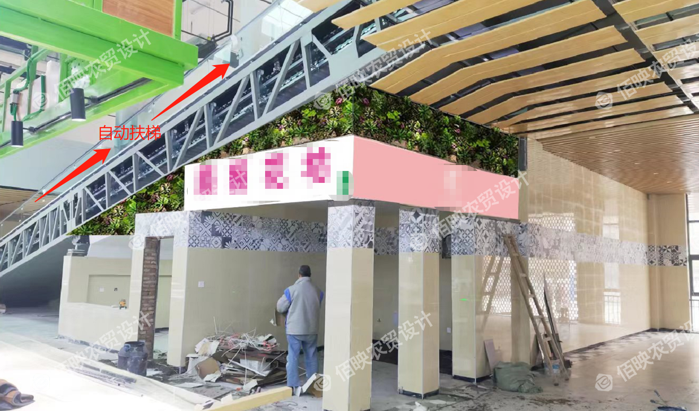 (如图所示,自动扶梯下方的倾斜空间,被充分利用,右侧规划了一间店面、左侧规划了一间配套用房)