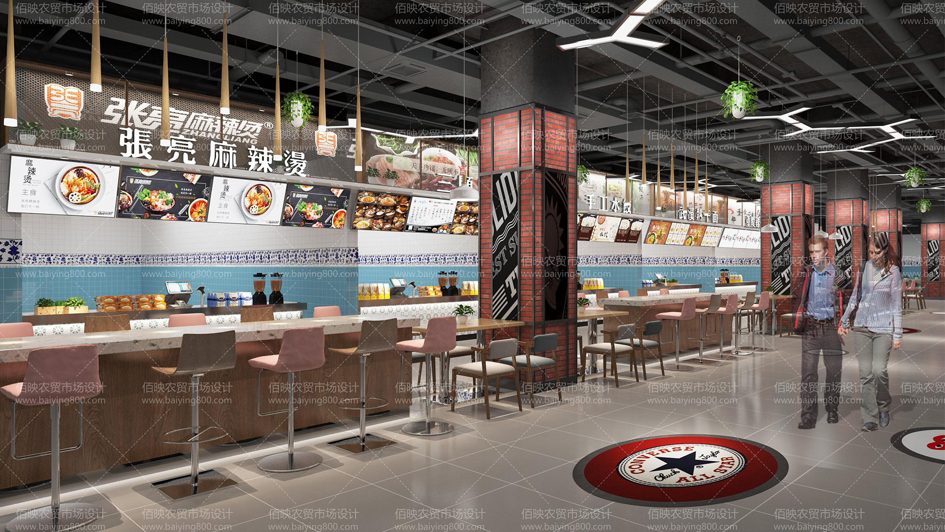 古色古香的深色木纹地板砖为摊位的侧立面增添别具一格的风采,摊位周围用一圈青花瓷砖装饰,顶部的店招同样应用青花风格,让逛市场的顾客随时置身处地于瓷都文化的海洋中。2-3层的商业区以餐饮、服装等为主,完美结合的业态搭配。设计风格和1层保持协调一致。
