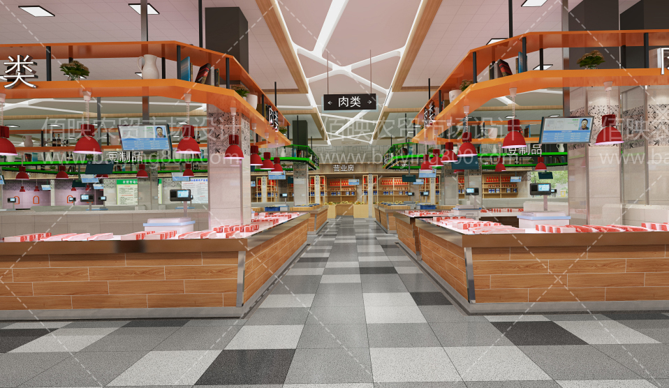 一个好的农贸市场设计不仅要考虑照明和美观,还要营造出空间的美感、优雅的氛围。不同摊位和业态对灯光的颜色要求和色彩是不一样的。例如蔬菜区应为绿色光;鲜肉区要使用红色光;熟食区可设计为黄色;水产区就要用蓝色灯光。为各个业态量身定制的灯光设计可以突出商品的特色,营造独特的视觉效果,激发人们的购买欲望。