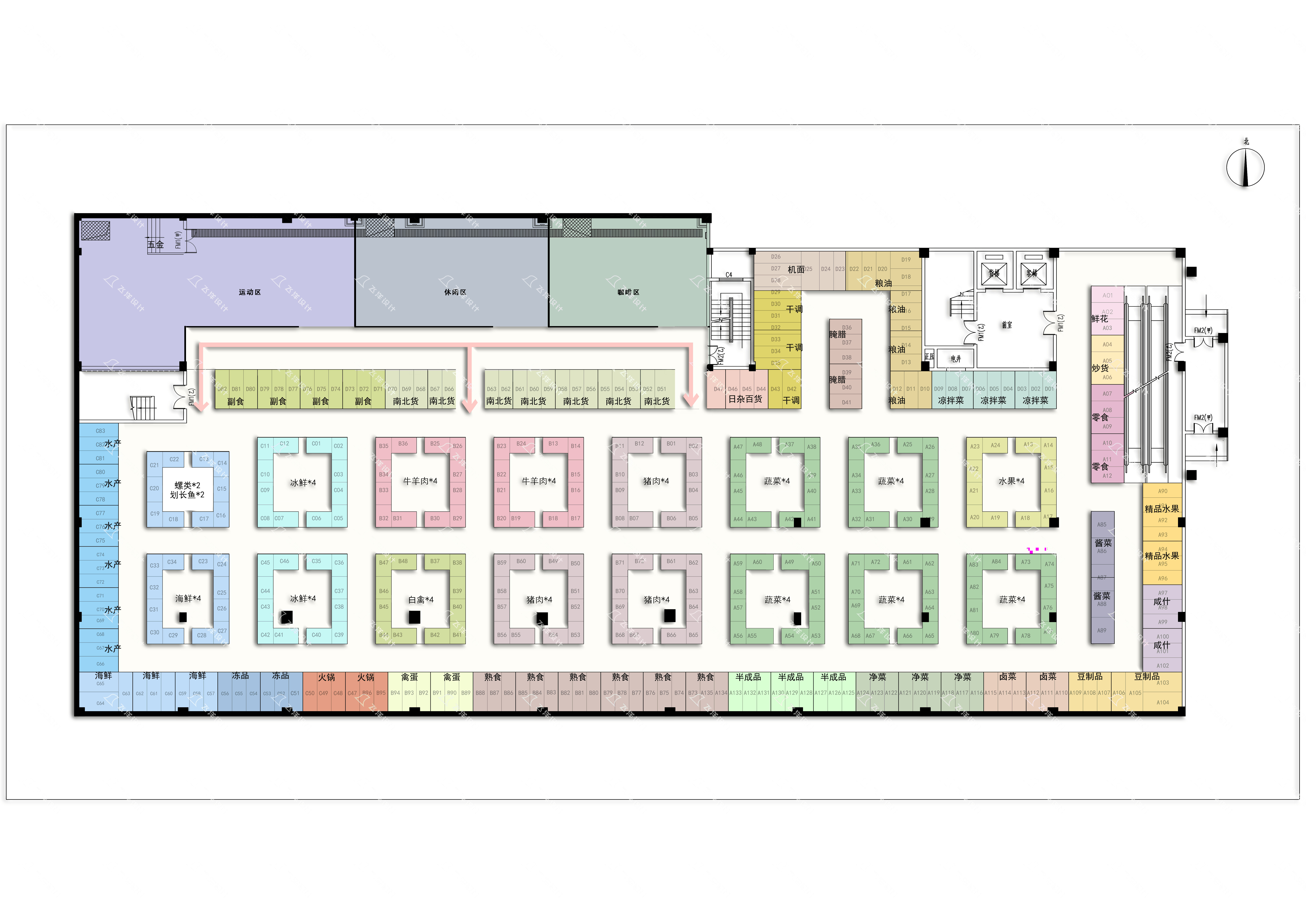 采用色彩编码系统,清晰划分果蔬、水产、肉类等不同业态区域