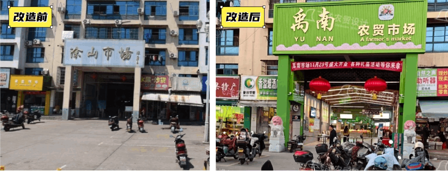 ▲ 改造前后对比绍兴禹南市场管理有限公司接手后,委托我司以"省三星级市场+省放心市场+五化市场"为设计标准,对市场进行全面升级。凭借创新的设计理念与精细化的空间规划,改造后的禹南农贸市场成功通过相关部门省创星办三星级验收,成为区域农贸市场改造的成功案例。如今,这里不仅恢复了往日的热闹,更以智慧化、规范化的运营模式,为周边居民提供更高品质的消费体验。