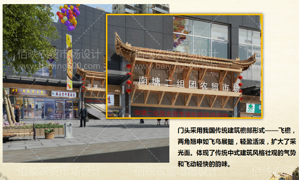 以下为例:是温州某农贸市场项目的规划设计方案,因其位于温州市鹿城区南塘附近,且与南塘中医药街区仅一路之遥,故通过挖掘其区位文化、人文精神后,量身定做了如下方案: