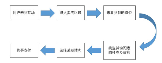 用户来到农贸市场——进入肉类摊位区——来看到我的摊位——挑选并询问猪肉种类及价格——选择某款猪肉——购买支付
